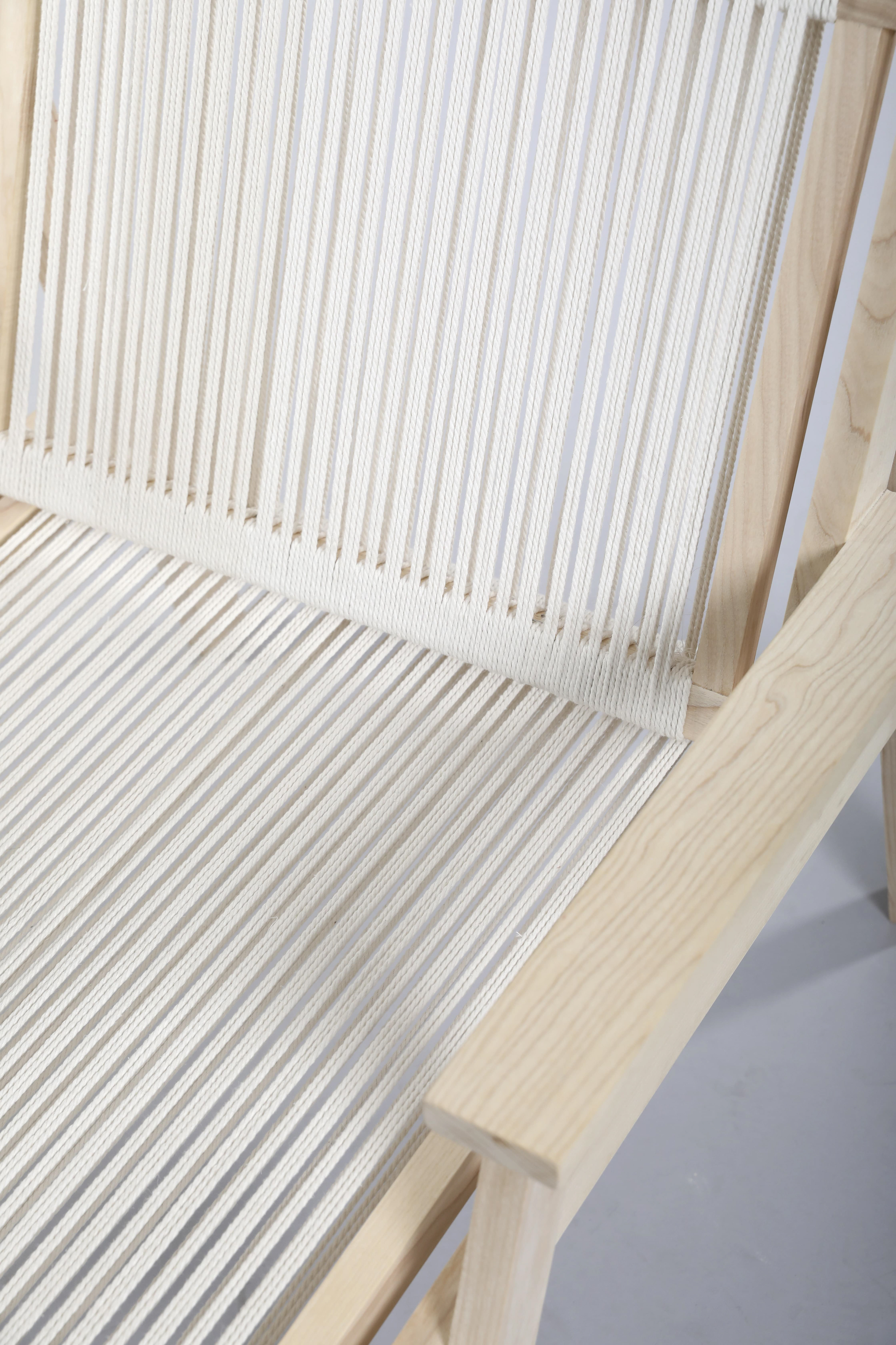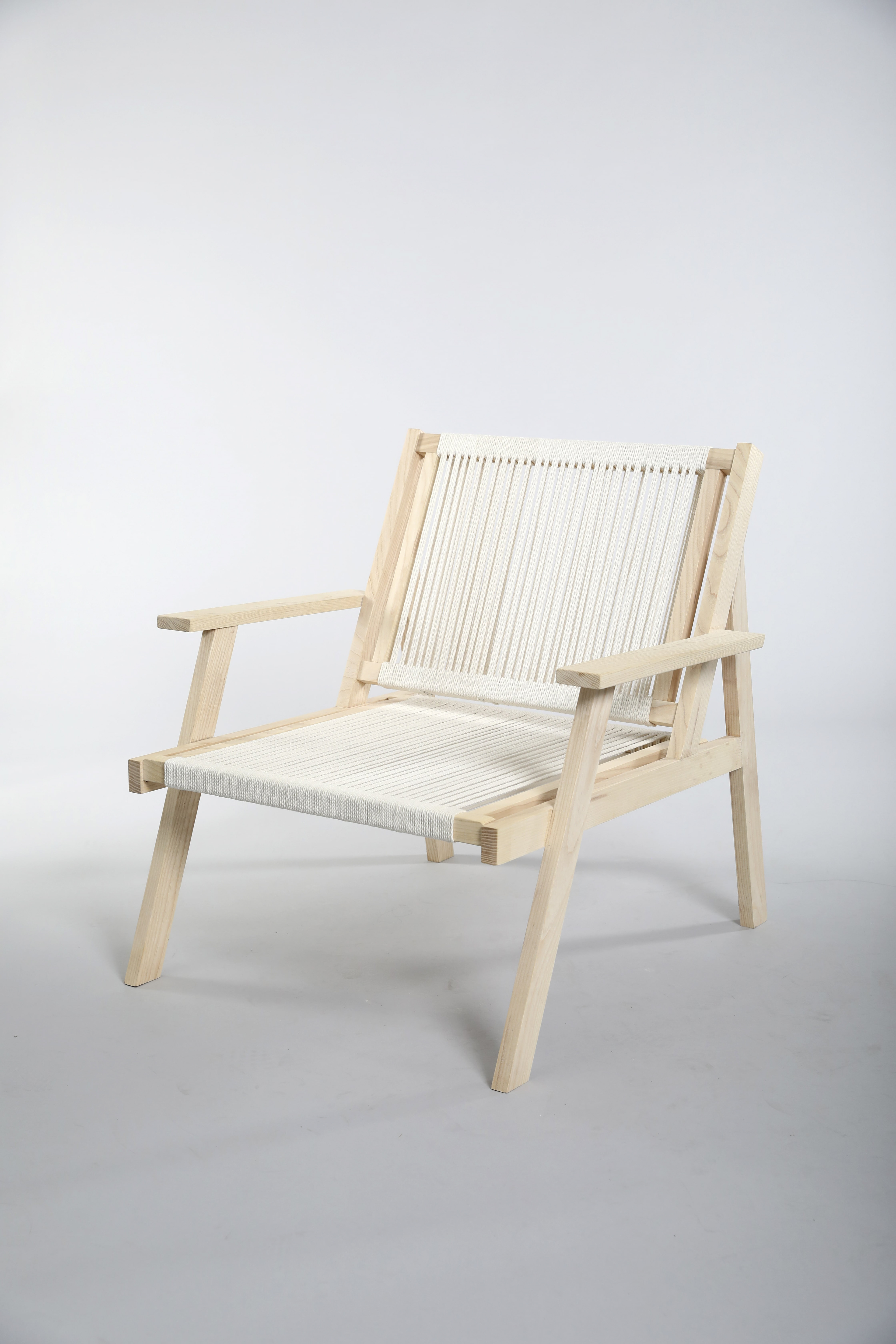 The EH01 Lounge Chair, inspired by the works of Danish designers Børge Mogensen and Hans Wegner, aims to combine aesthetics, comfort, and versatility in it’s design. The profile of the chair incoporates the concept of weaving through the connection of the front legs and armrests with the seat and back legs. The angles of the chair were chosen to provide the maximum comfort level in order for the chair to be used for long periods of time. Simplicity in color and material help to make the design versatile and a product that can be used for different needs. Macramé string, used in the construction of the seat, is durable while still being able to form to the body as one sits.