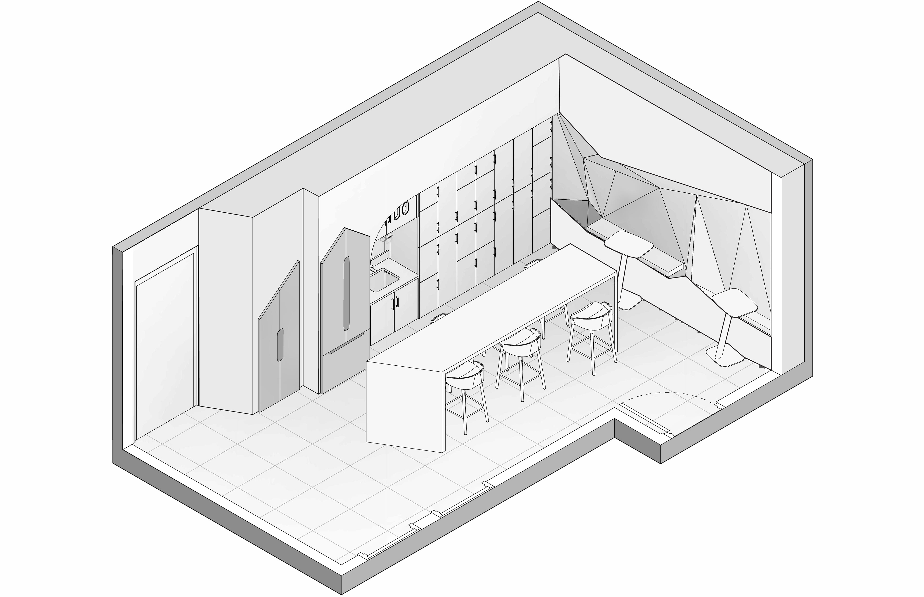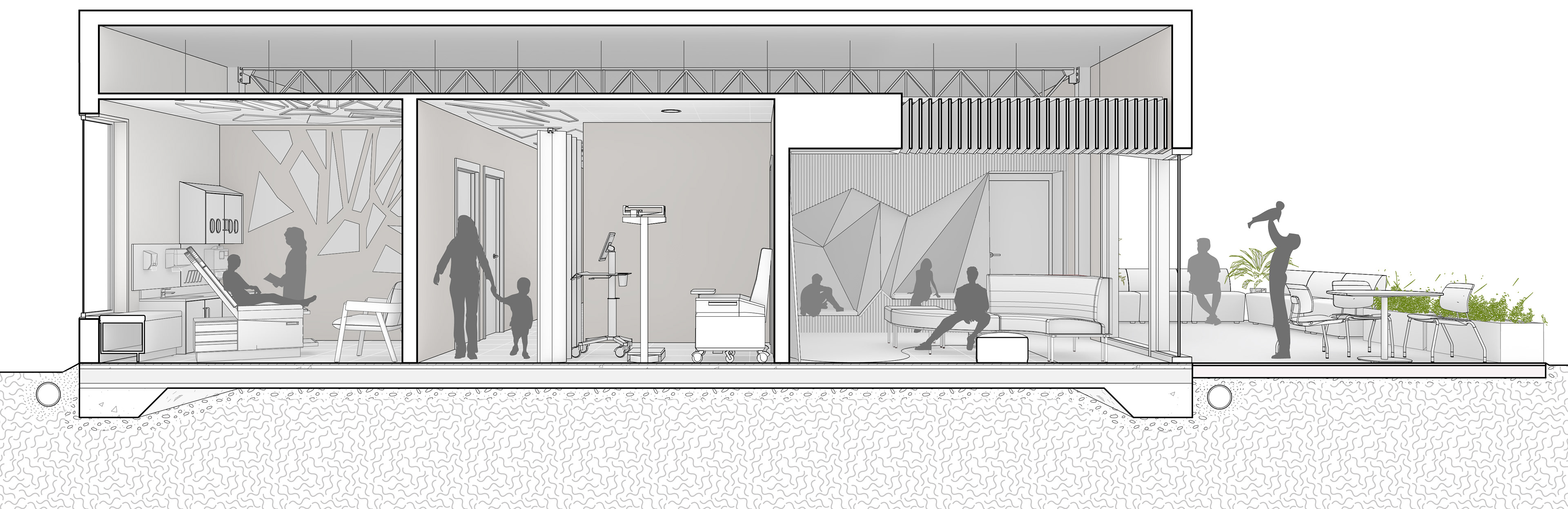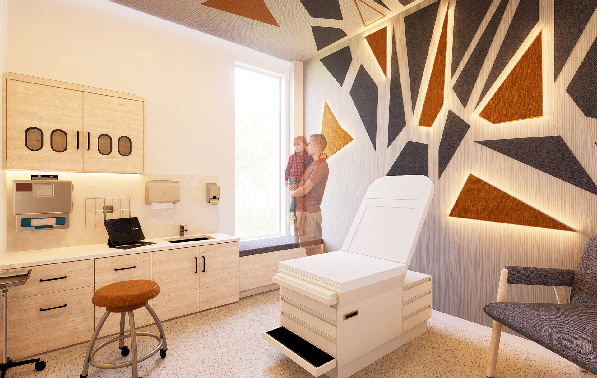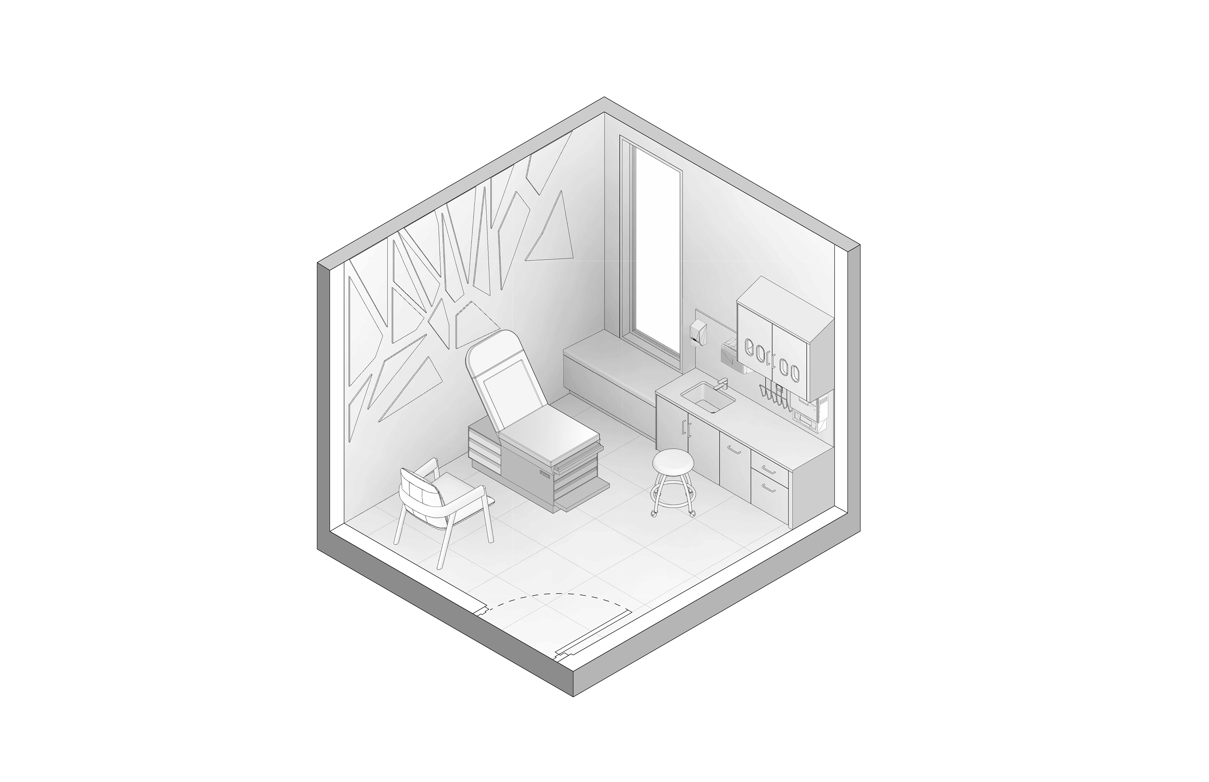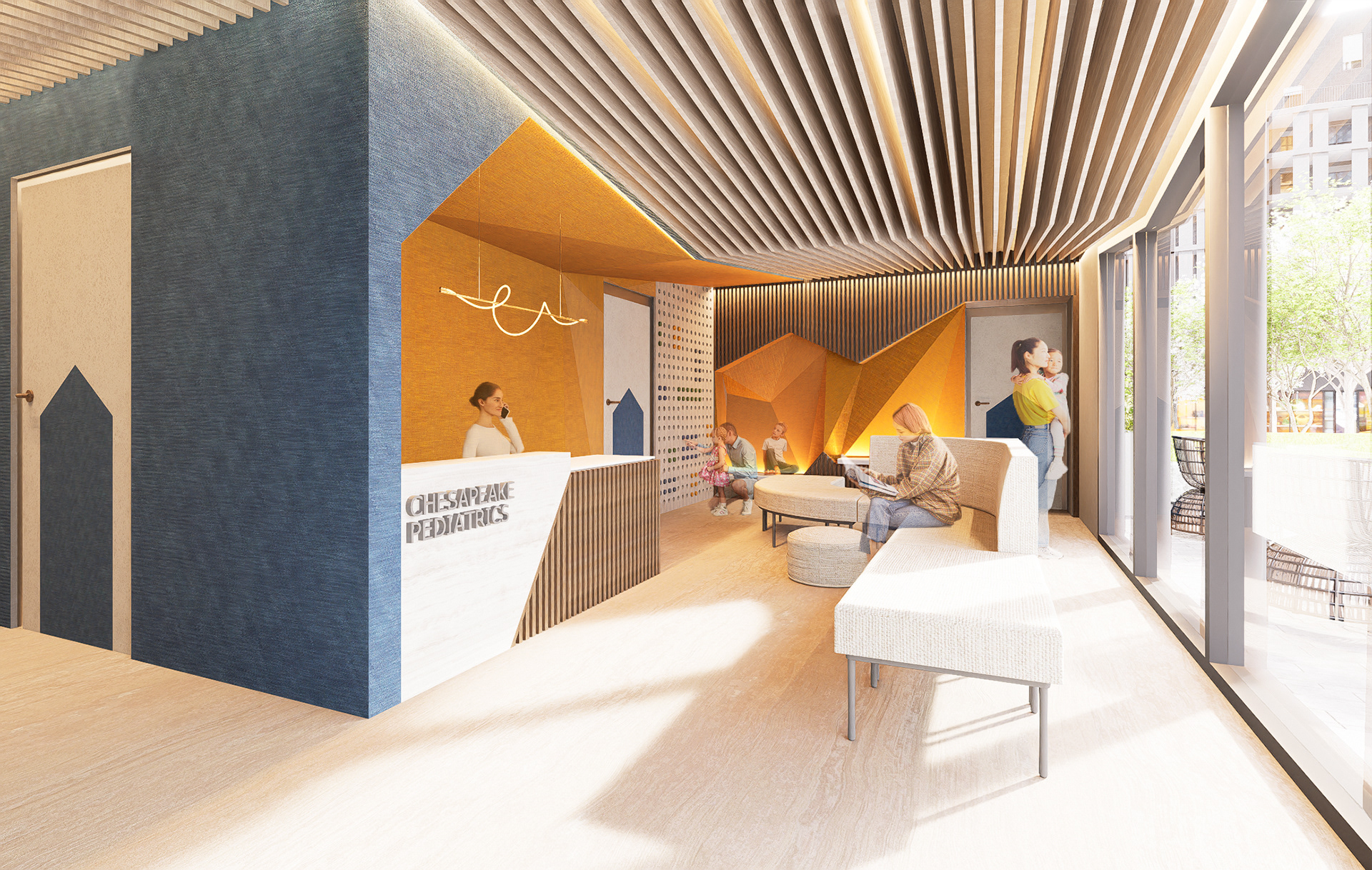 The design of Chesapeake Pediatrics is a clinic that provides comprehensive pediatric primary care from birth to age eighteen with accommodations to treat behavioral health issues. Located at 1149 E Lombard St, Baltimore, MD. The design is derived from the landscape and rock formations that are found along the Baltimore coast. The wall pattern, ceiling design, and furniture were inspired by the rigid edges of rock formations. These harsh lines and formations are contrasted with muted blue and orange colors and soft textures to create a dynamic and welcoming space for those occupying the space. The abstract design creates an interesting composition providing character to the interior space. The program is divided into three areas, shared, private employee, and private patient space. These areas were assigned as a result of analysis and based on the concepts of accommodation, the sequence derives from the patient and employee needs by accommodating the people and the things that go into the space. This pediatric office design is centered around the health and well-being of children along with their families.