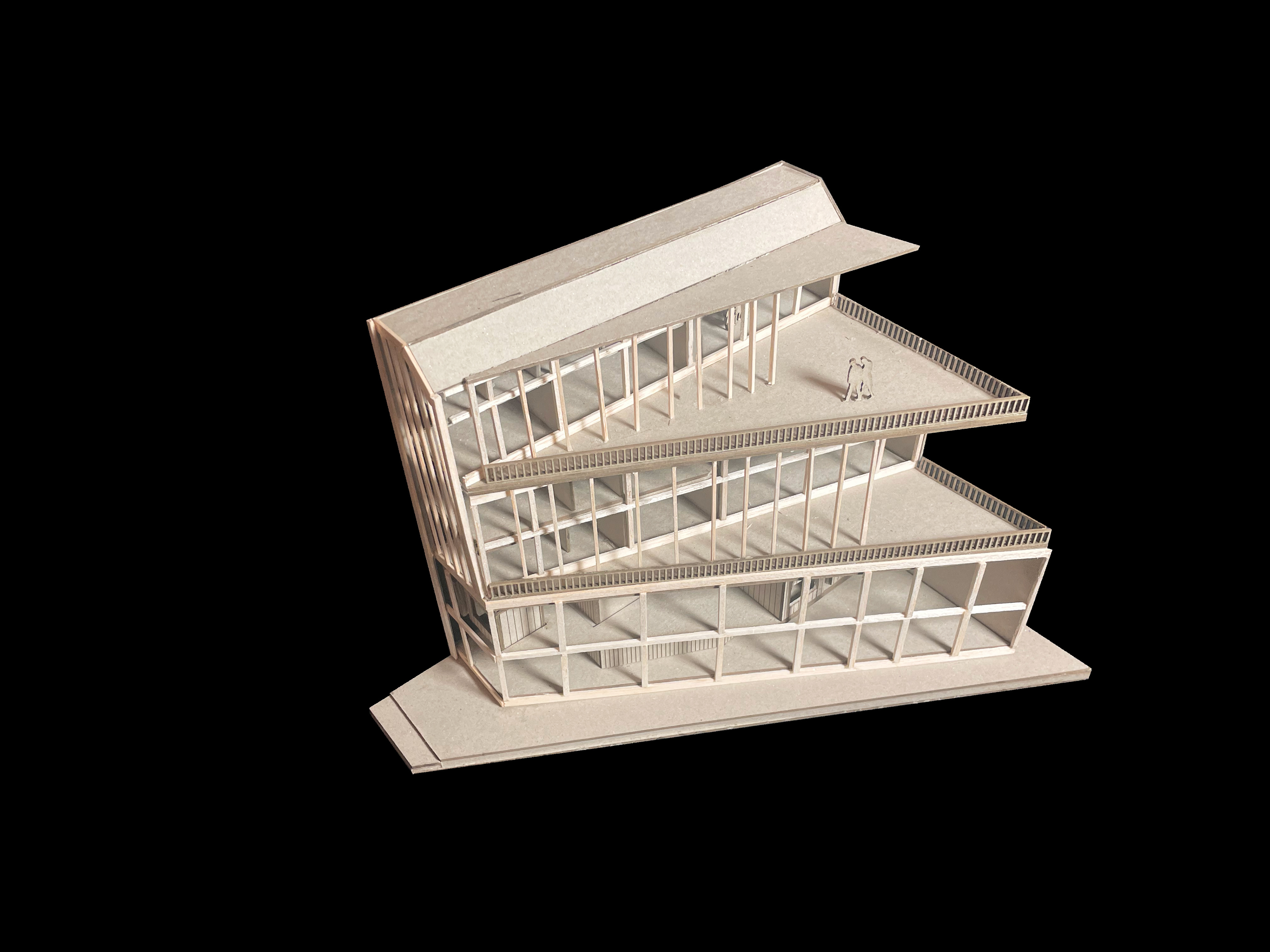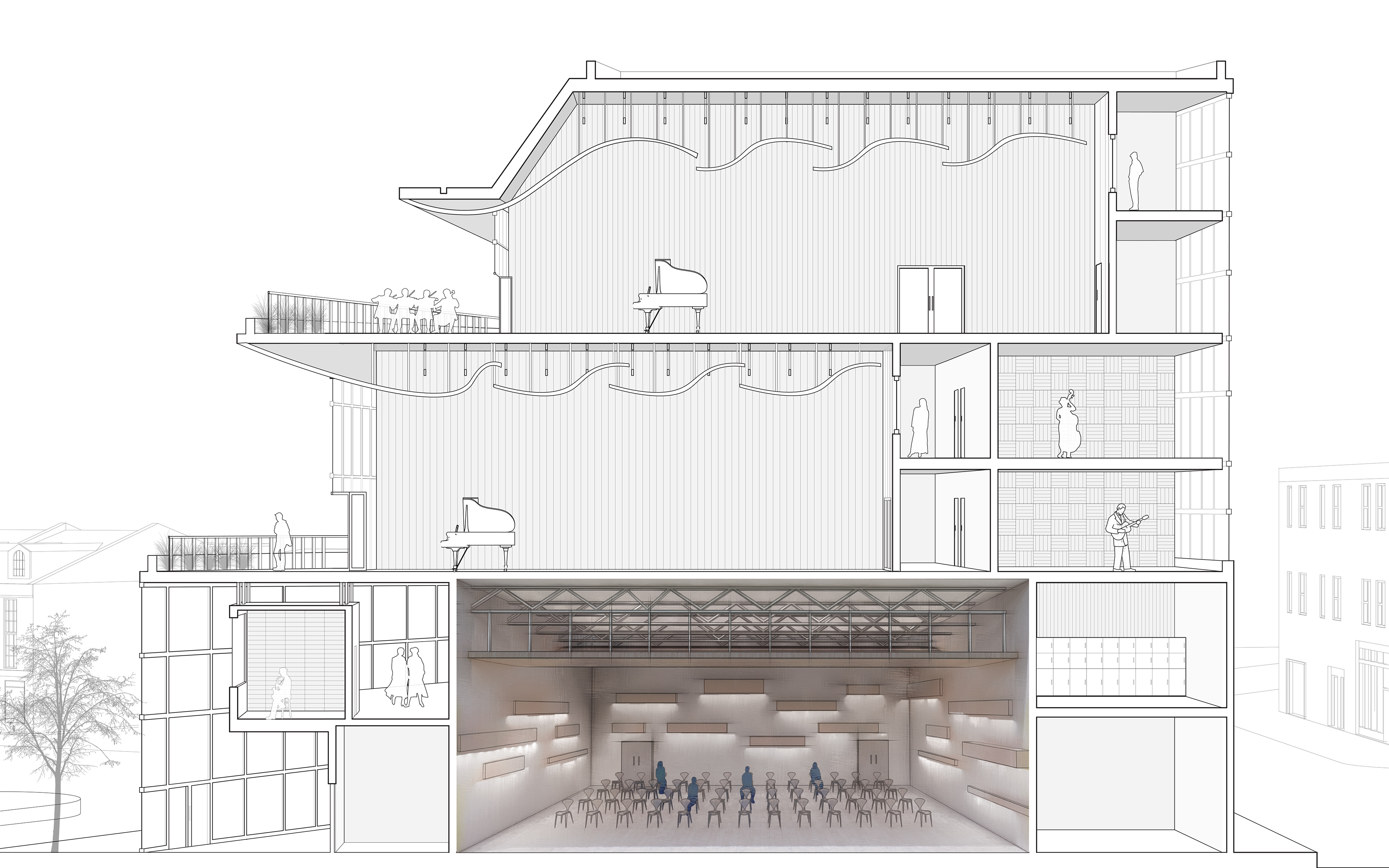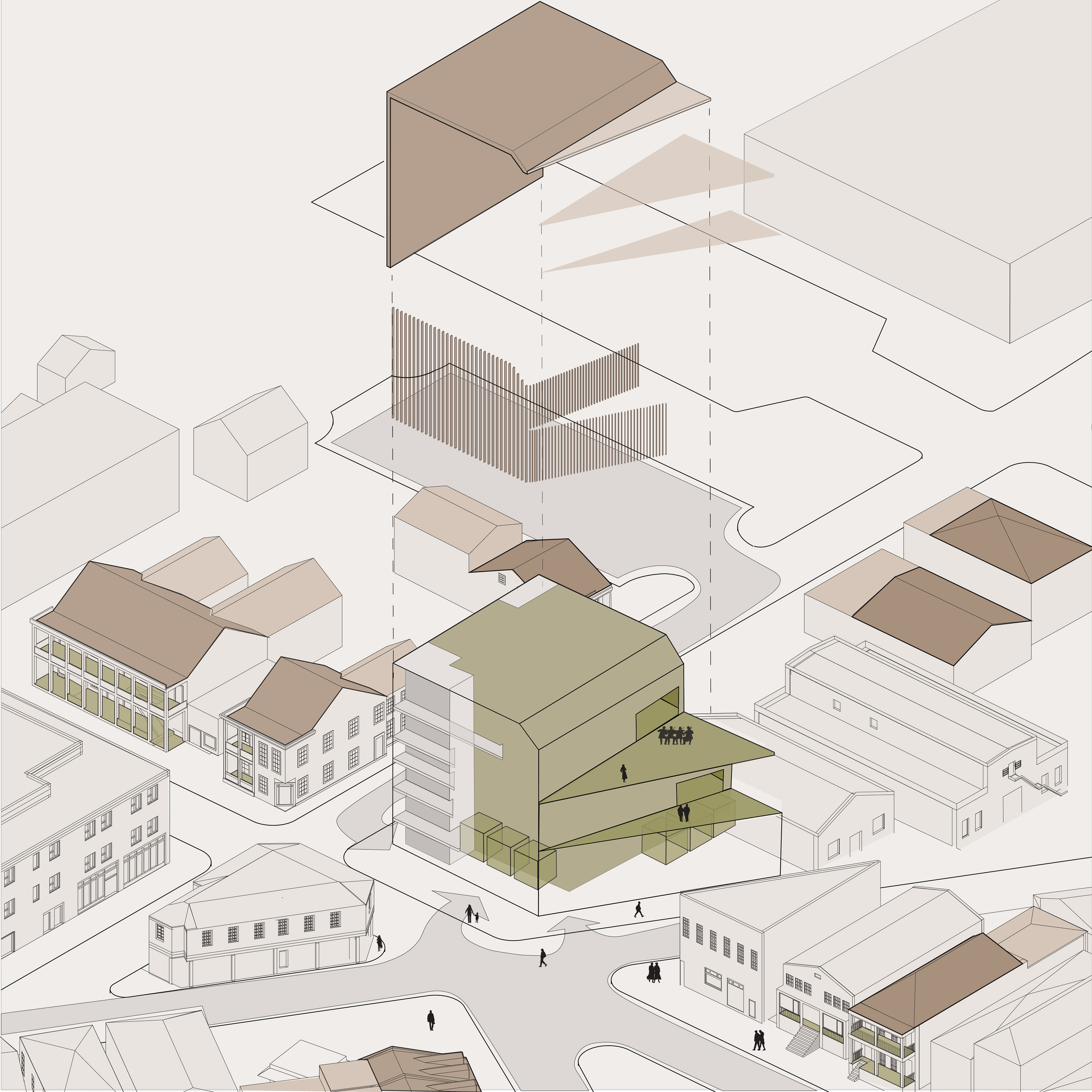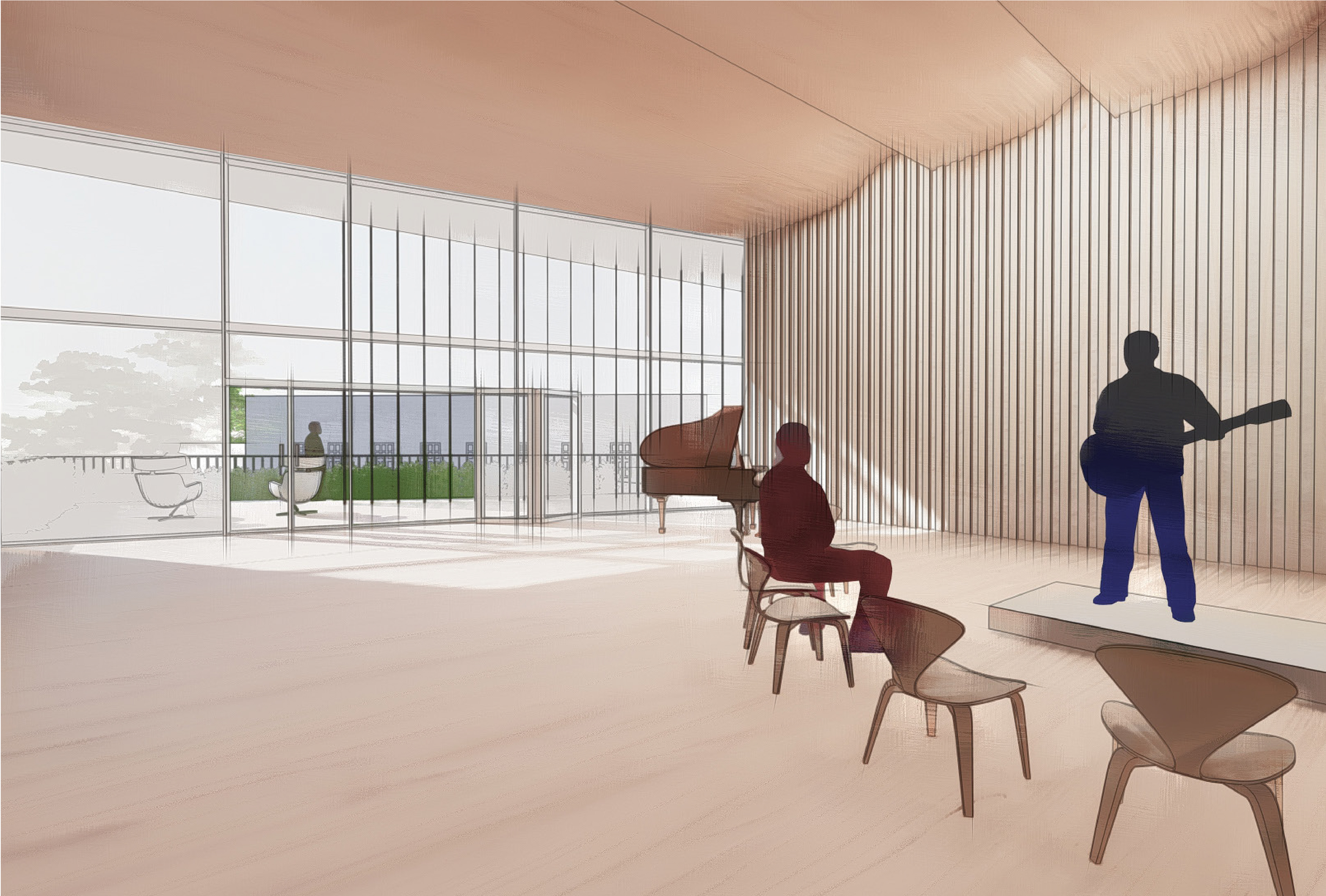 Musical Synthesis, located in New Orleans, Louisiana, is a design proposal for a music school within the Lower Garden District. The project’s main objective is to take elements from the larger context of the city and urban fabric within the surrounding area of the site, in order to create a structure that cohesively blends within them. Through the analysis of New Orleans, the Mississippi River became an important feature in the design and layout of the city with all of the roadways running perpendicularly to it. As a consequence, site boundaries adopted unique geometries, therefore, shaping the city architecture in creative ways. The school takes on the form of the existing site and uses its angle in order to create the most efficient form. Looking to the immediate context, the surrounding area maintains an interesting set of design elements with the use of the Camelback-Style home, multi-level porch, and lower building heights. In order to use these key features, the proposal implements the use of terraces allowing the public to connect with the school as music is being played in the outdoor theater spaces. The glass curtain walls are another design choice that is meant to open up to the street level and creates a blend between the interior of the school and the outside city. In order to shield any harsh natural lighting coming into the building, vertical louvers were placed around the southern and western elevations.