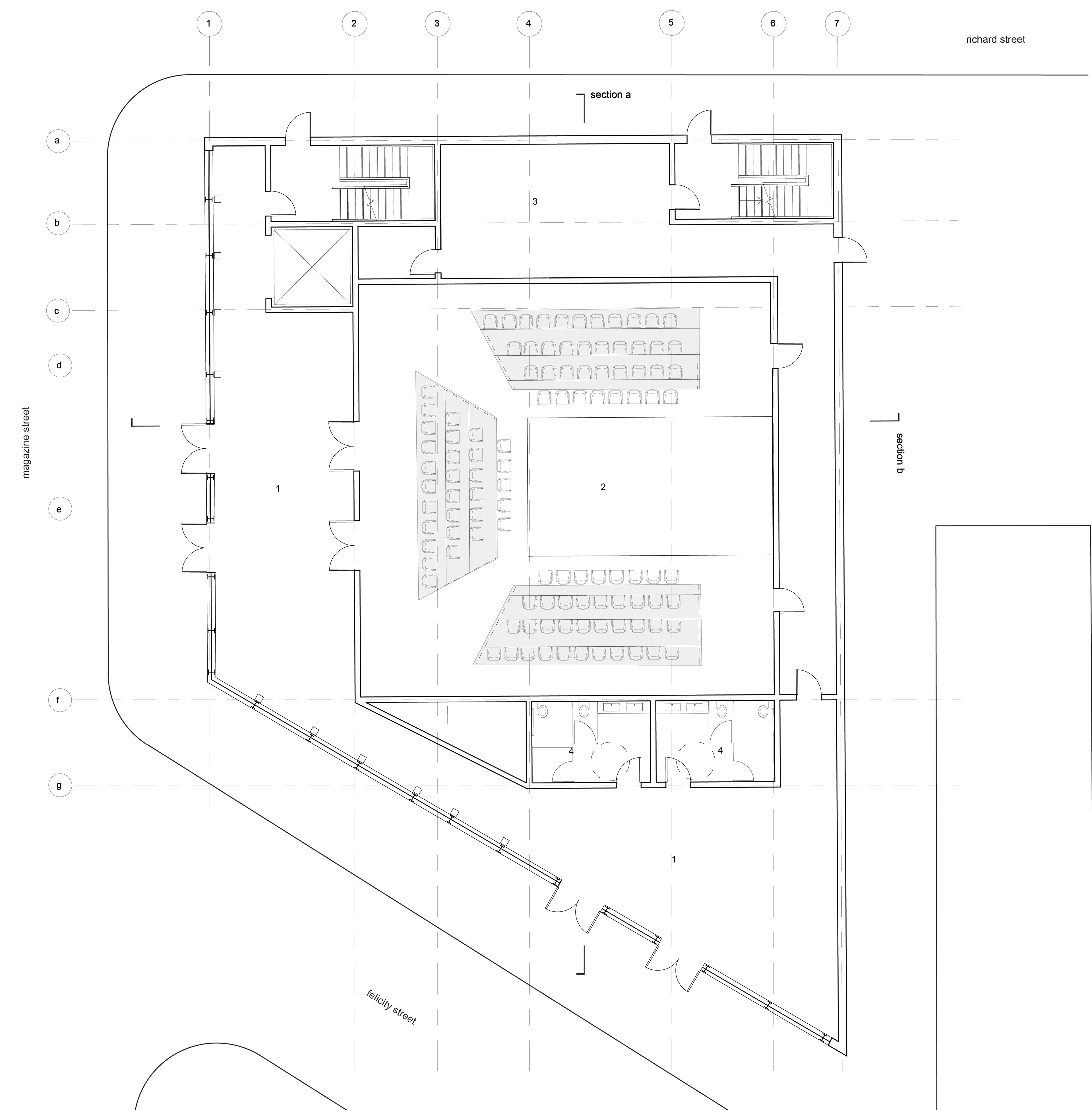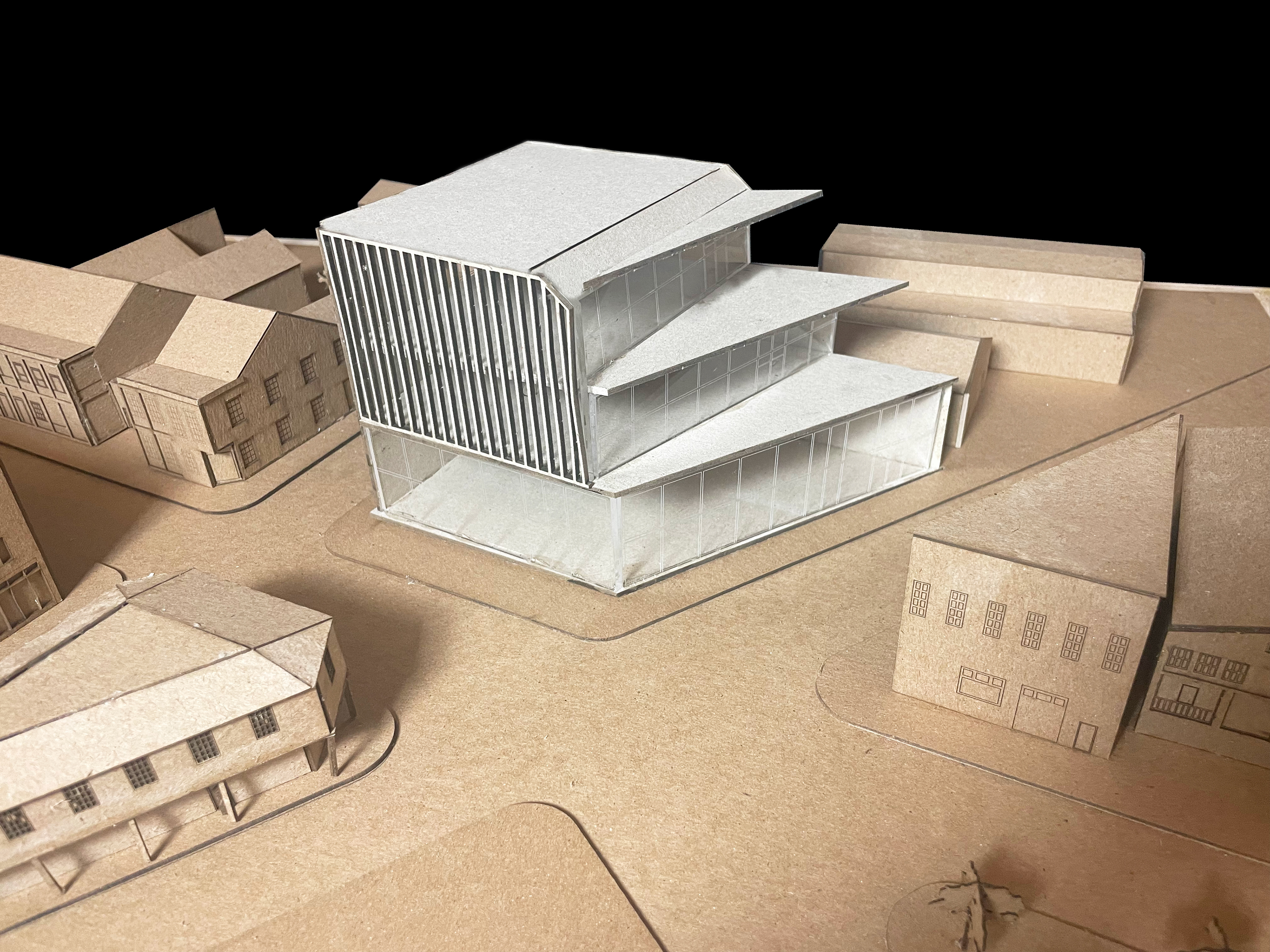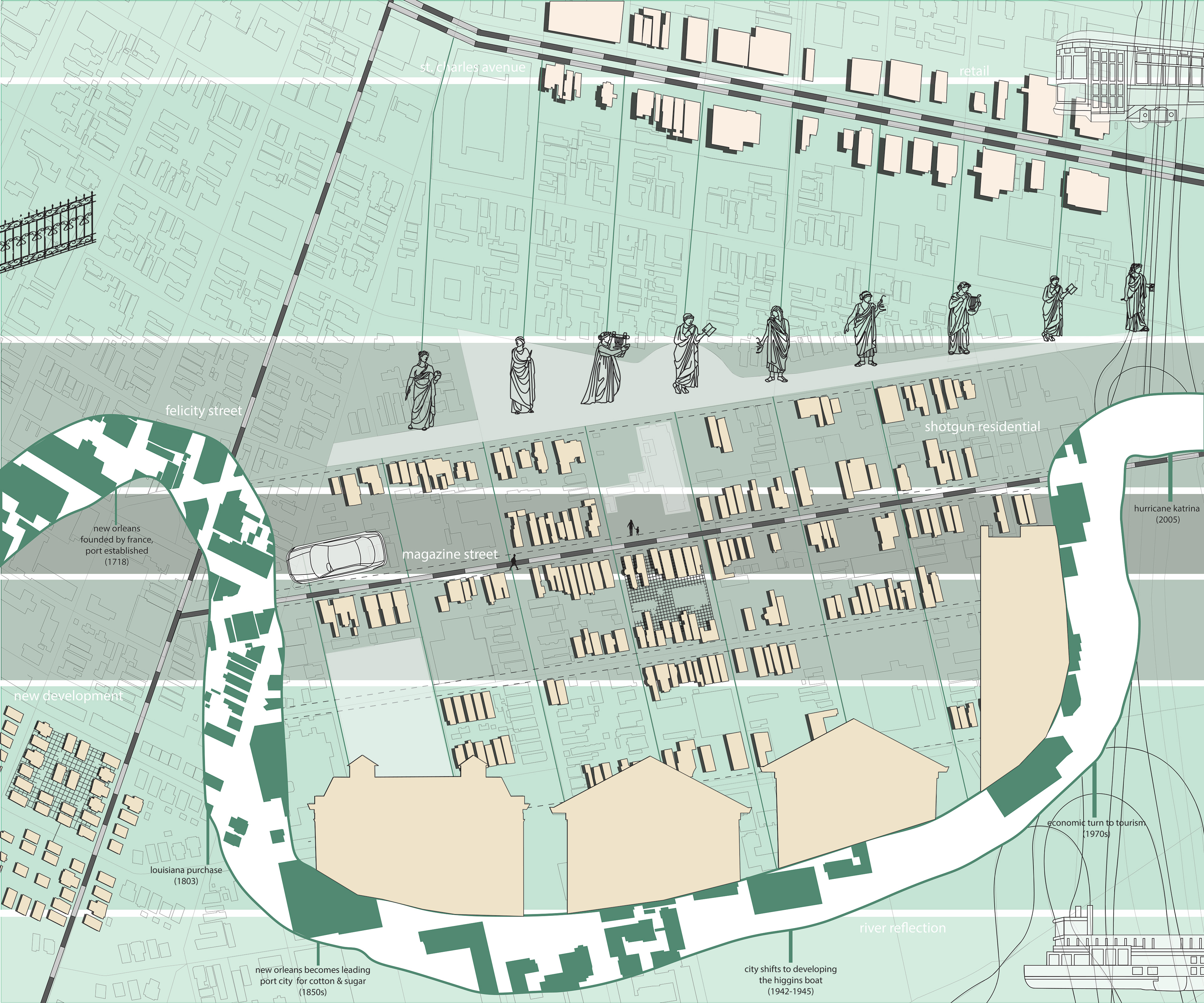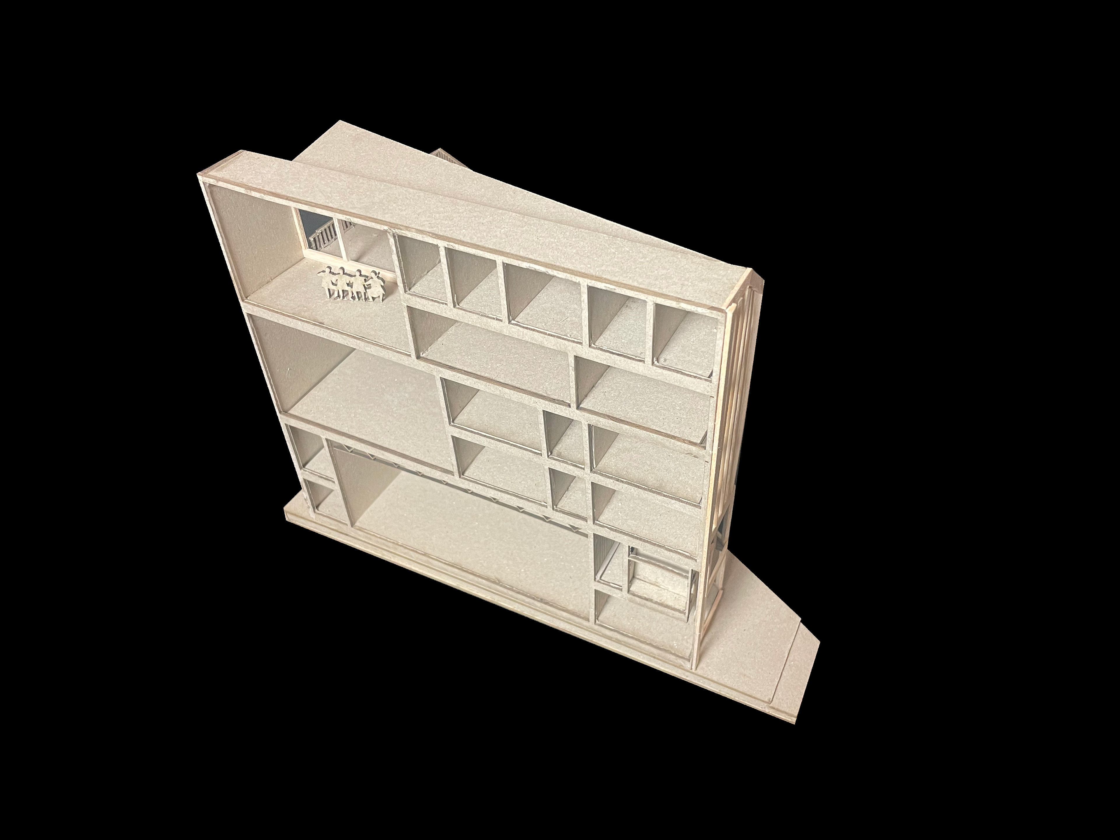 Musical Synthesis, located in New Orleans, Louisiana, is a design proposal for a music school within the Lower Garden District. The project’s main objective is to take elements from the larger context of the city and urban fabric within the surrounding area of the site, in order to create a structure that cohesively blends within them. Through the analysis of New Orleans, the Mississippi River became an important feature in the design and layout of the city with all of the roadways running perpendicularly to it. As a consequence, site boundaries adopted unique geometries, therefore, shaping the city architecture in creative ways. The school takes on the form of the existing site and uses its angle in order to create the most efficient form. Looking to the immediate context, the surrounding area maintains an interesting set of design elements with the use of the Camelback-Style home, multi-level porch, and lower building heights. In order to use these key features, the proposal implements the use of terraces allowing the public to connect with the school as music is being played in the outdoor theater spaces. The glass curtain walls are another design choice that is meant to open up to the street level and creates a blend between the interior of the school and the outside city. In order to shield any harsh natural lighting coming into the building, vertical louvers were placed around the southern and western elevations.
