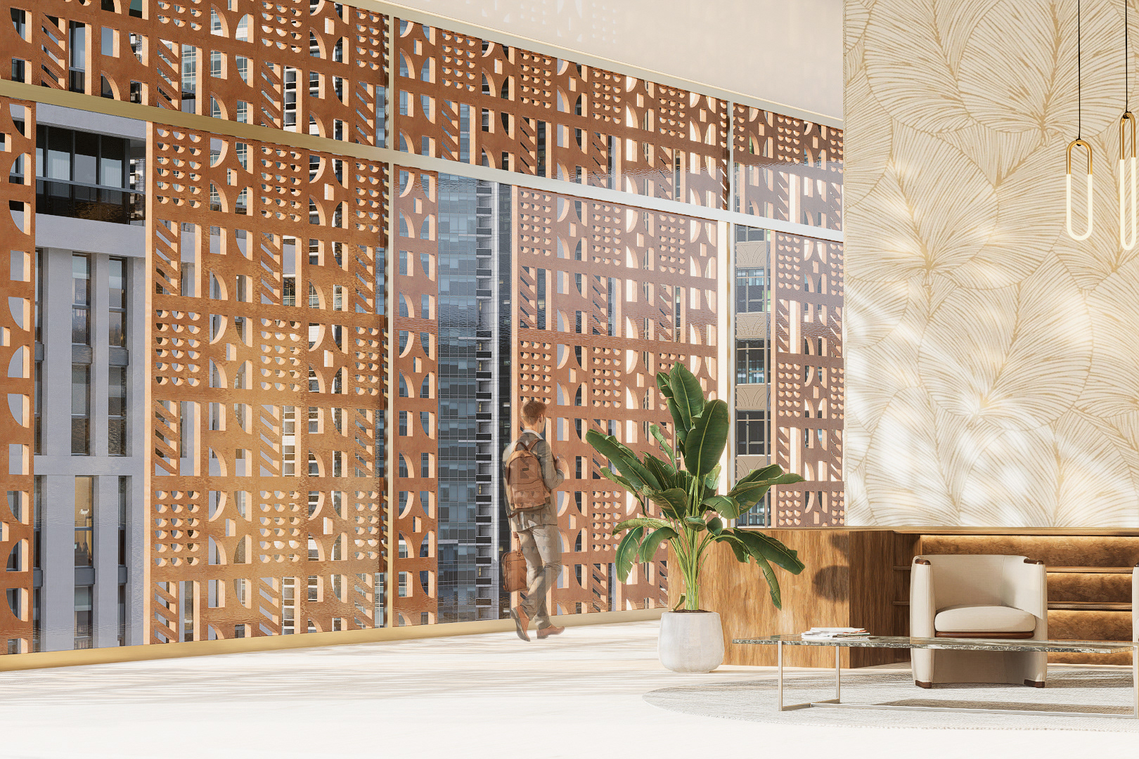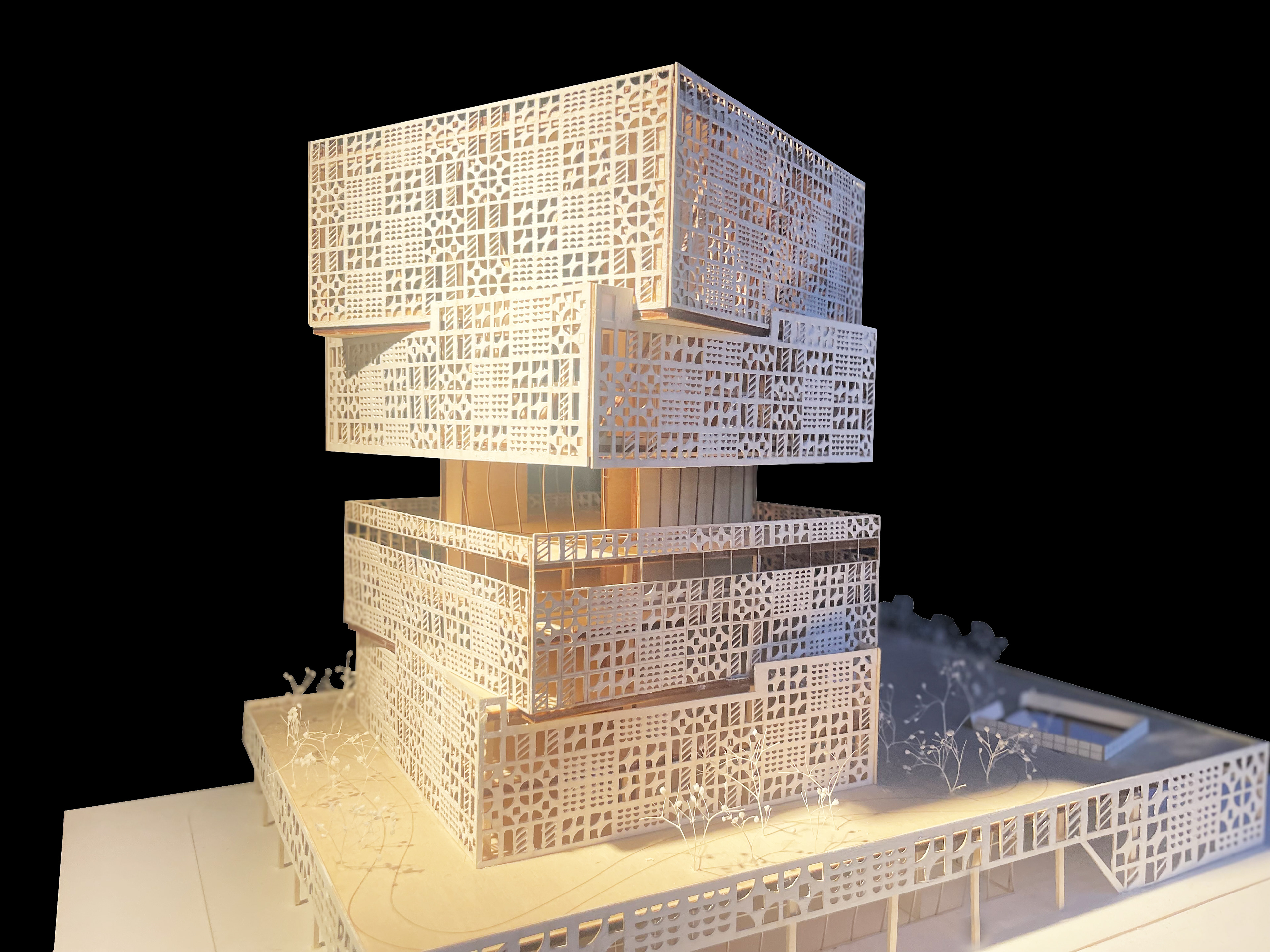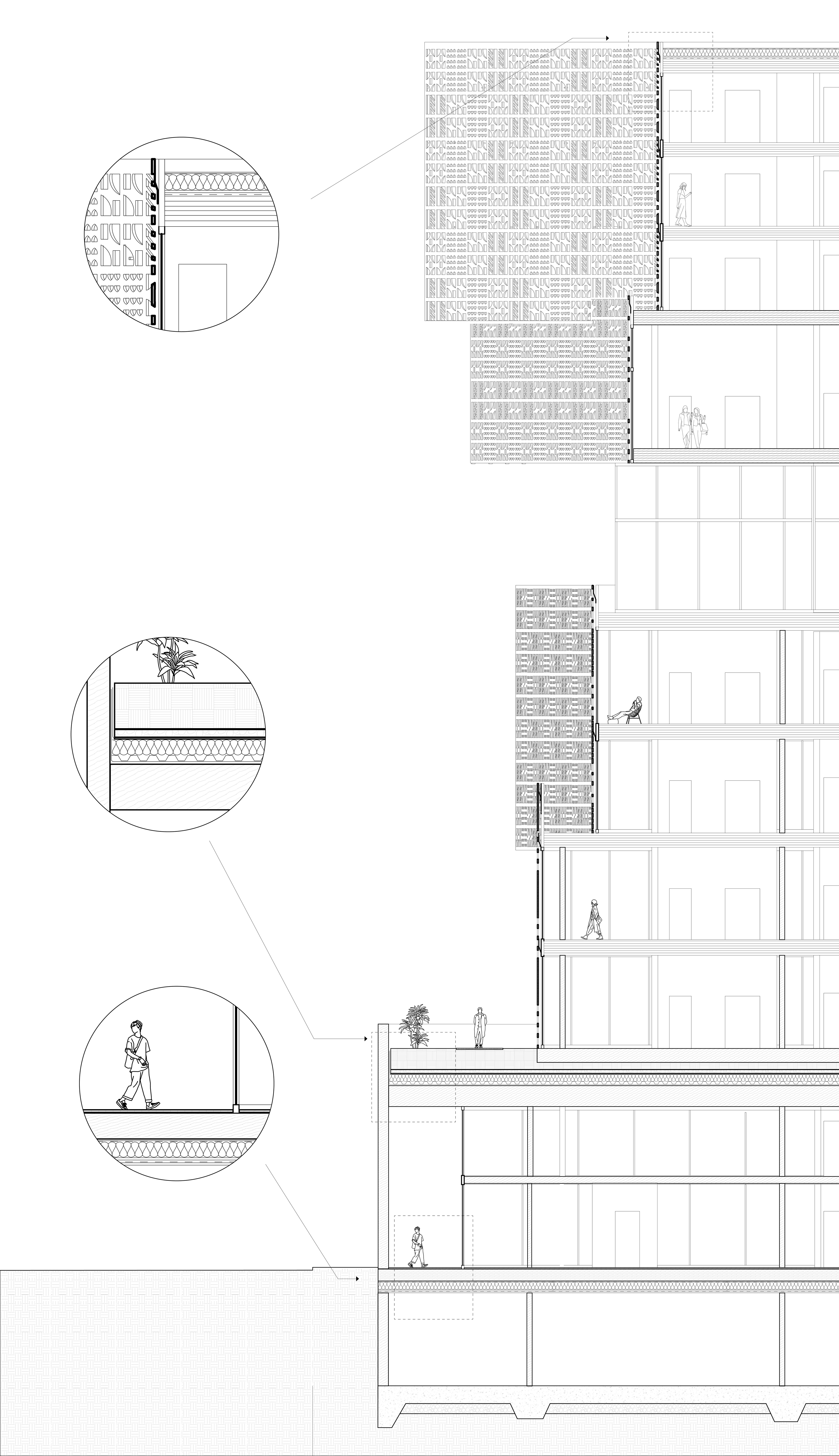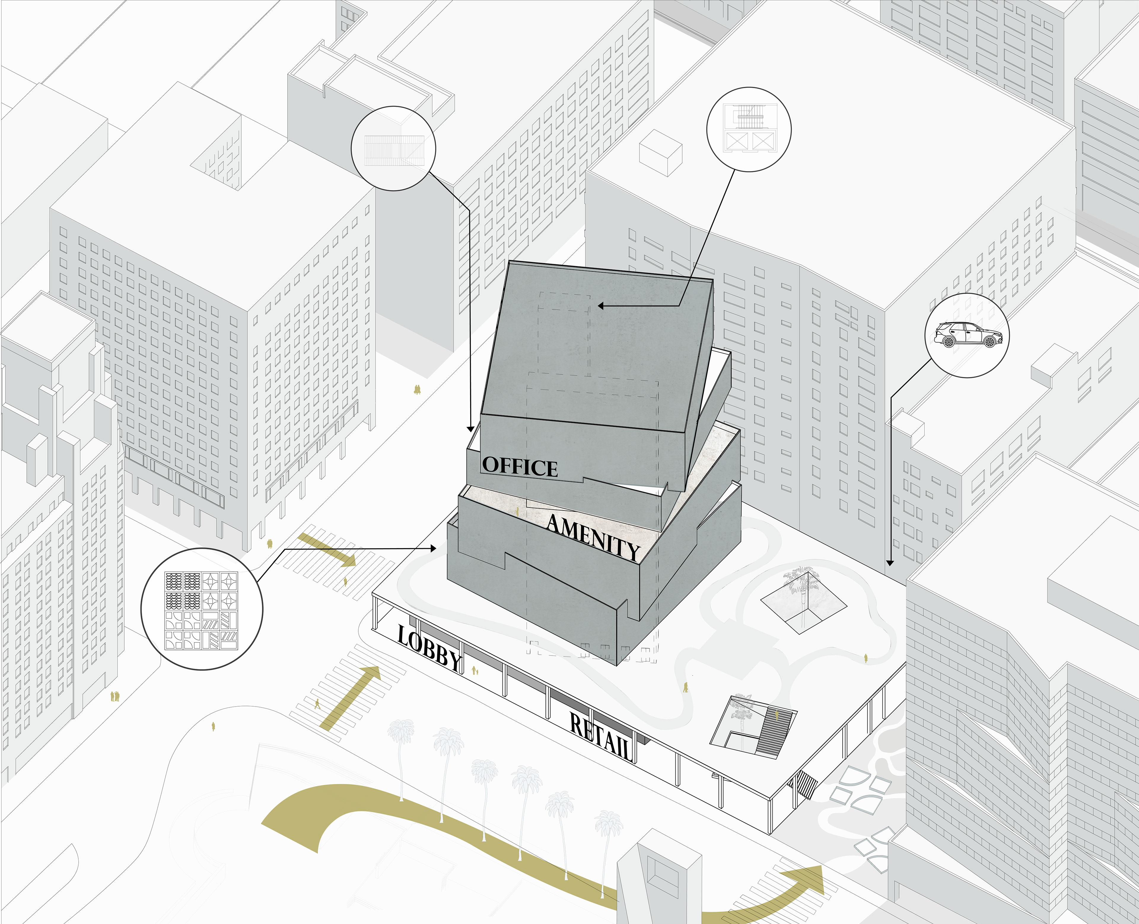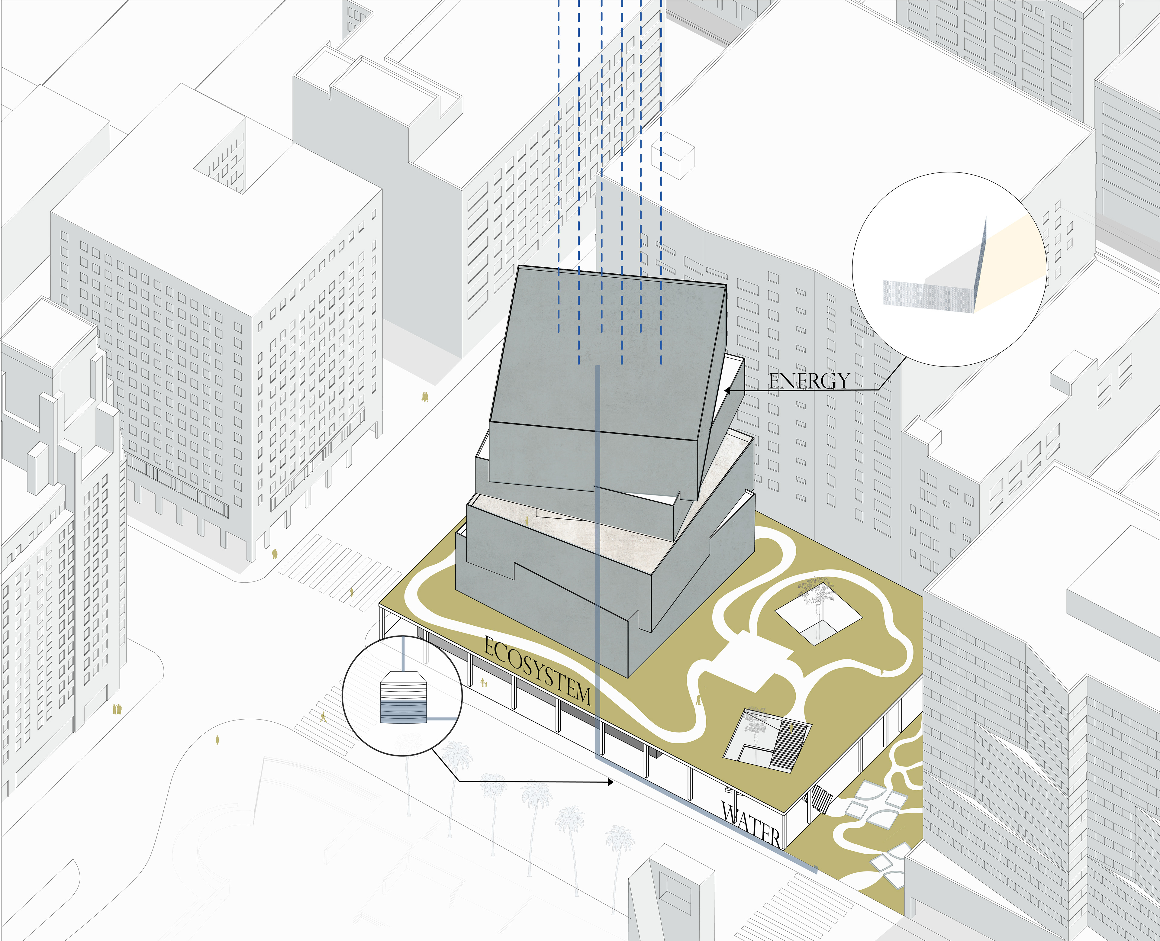 Twisting Ecosystems is an innovative office project in the heart of downtown Los Angeles. The design of the office aims to connect occupants with natural elements through the use of an extensive outdoor terrace, connection to the adjacent park, and a twisted form that removes the rigidity and stoic feel to the tower. and replaces it with more opportunities for light and greenery. There are twelve total floors with retail space occupying the first two levels in order to bring in foot traffic from the street. The exterior facade, made from perforated terracotta panels, eliminates harsh sunlight to maintain energy efficiency and rainwater is collected using cisterns that are then used to water the vegetation on site.